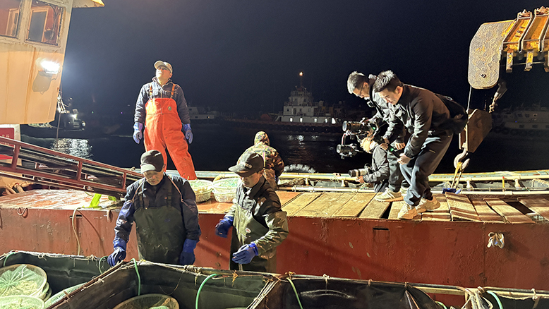 攝制組凌晨在翻身河漁港拍攝滿載而歸的漁船卸載捕獲的海鮮。 (本報記者 郭乃軍 攝)