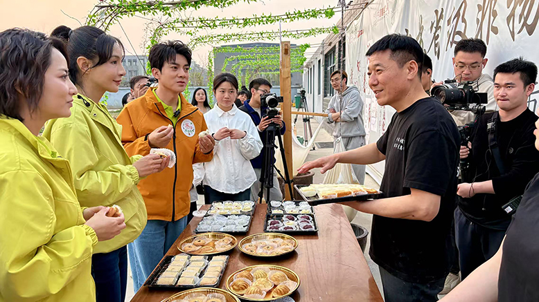 攝制組在白首烏非遺館拍攝手工古法制作首烏糕點技藝。