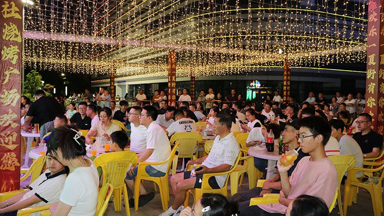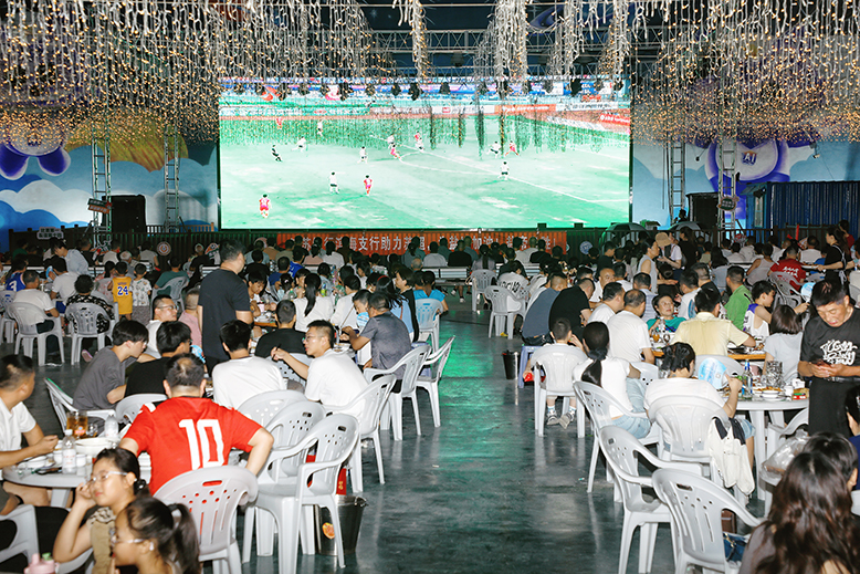 夜間經(jīng)濟(jì)產(chǎn)業(yè)園的露天觀賽區(qū)依舊是年輕人的主場。三五成群的年輕人圍坐在一起,桌上擺滿了冰飲、小食,隨著賽事推進(jìn),大家時而齊聲歡呼,時而屏息凝神。剛畢業(yè)的小周和同事們還特意帶了坐墊,邊看比賽邊分享著工作趣事。不遠(yuǎn)處的燒烤攤前煙火升騰,攤主們早早就掛出“進(jìn)球特惠”的燈牌,“烤串買三送一,趁熱來擼!”的吆喝聲此起彼伏。據(jù)統(tǒng)計(jì),開賽僅1小時,園區(qū)內(nèi)的烤串、冰飲、小龍蝦等餐飲消費(fèi)額就輕松超過平日整晚,年輕人舉著杯子碰出清脆聲響,把觀賽的熱情融進(jìn)了夏夜的煙火里。