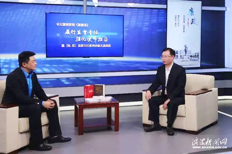 縣委常委、縣紀(jì)委書記、縣監(jiān)委主任李杰(右)做客鹽城電視臺(tái)《黃海廉潮》欄目,介紹我縣學(xué)習(xí)貫徹《監(jiān)察法》經(jīng)驗(yàn)做法。