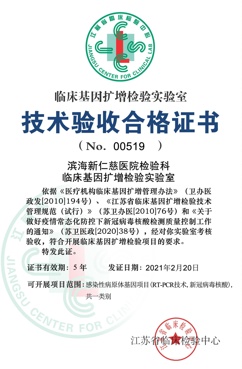2月20日,濱??h新仁慈醫(yī)院PCR實(shí)驗(yàn)室順利通過江蘇省臨床檢驗(yàn)中心審核驗(yàn)收,正式投入使用,為今后疫情防控工作常態(tài)化和感染性疾病科的發(fā)展提供了堅(jiān)實(shí)的基礎(chǔ)條件。該院PCR實(shí)驗(yàn)室可開展的檢驗(yàn)項(xiàng)目為感染性病原體基因項(xiàng)目(RT-PCR技術(shù),新冠病毒核酸)。