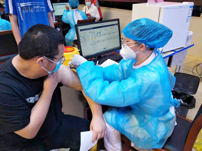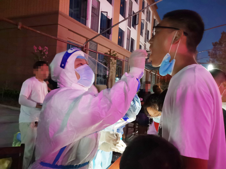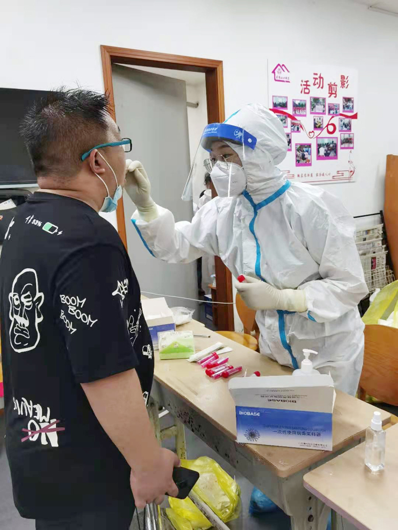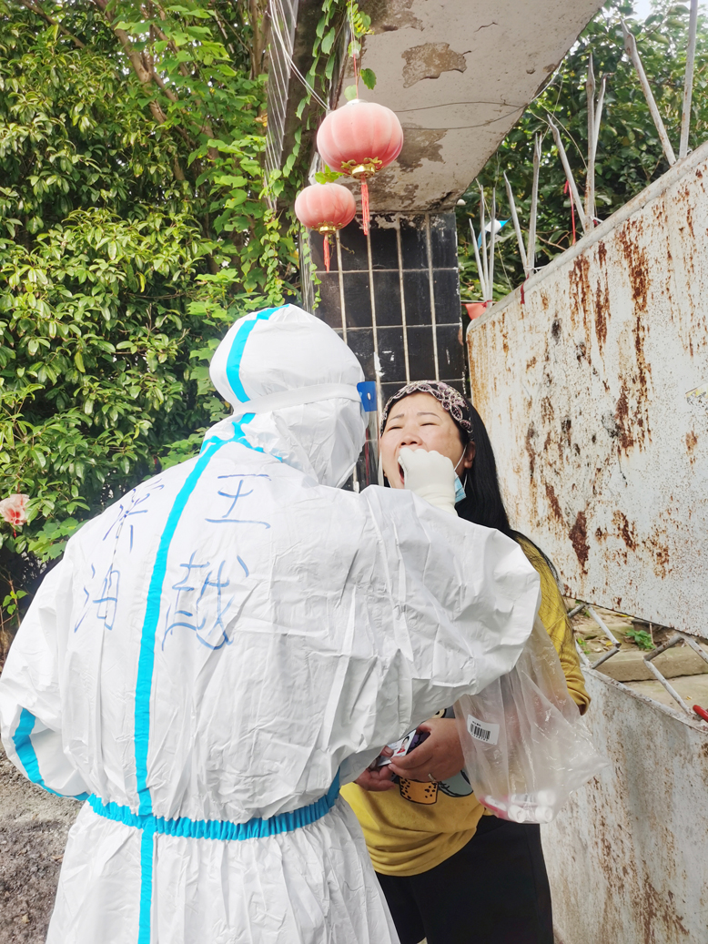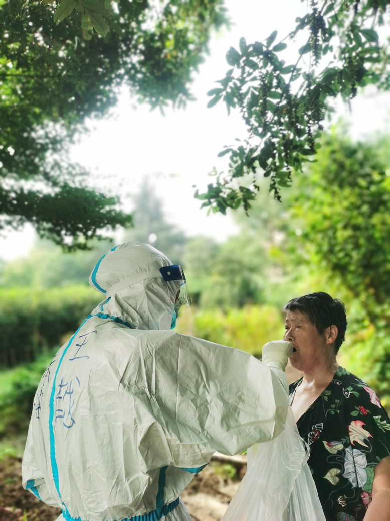 8月4日夜晚,當(dāng)該院接到縣衛(wèi)健委馳援揚州的命令后,在家負(fù)責(zé)醫(yī)務(wù)工作的副院長單杉林馬上同其他領(lǐng)導(dǎo)會商后連夜開展緊急動員,很快從志愿者中選出胡曉雨、沈亞、陸雅翠、陳昊月、潘金玉共5位年輕護士組成了支援揚州抗疫小組,經(jīng)過簡單的獻(xiàn)花送行儀式,第二天上午9點就同全縣抽調(diào)的其他醫(yī)護人員一道向揚州進發(fā)。下午4點多,她們五姐妹就被指定到蓮花社區(qū)開始對當(dāng)?shù)鼐用襁M行核酸采集工作,一直忙到夜里近10點,她們共采集核酸標(biāo)本5396份。尤其是骨科護士胡曉雨家里有個僅3歲的孩子,平時一天也離不開母親的照料。為支援揚州抗疫,她毅然決定將孩子送至家住響水的母親那里,自己義無反顧地率先報名讓院里挑選。8月7日,經(jīng)過持續(xù)3天在烈日下超負(fù)荷工作,沈亞、陸雅翠等4名護士出現(xiàn)輕微中暑現(xiàn)象,揚州中醫(yī)院的同伴馬上為她們送來藿香正氣水、風(fēng)油精涂用后,她們又繼續(xù)投入了現(xiàn)場核酸采集工作,分秒必爭地為當(dāng)?shù)鼐用窨箵粢咔槎嘧髫暙I(xiàn)。