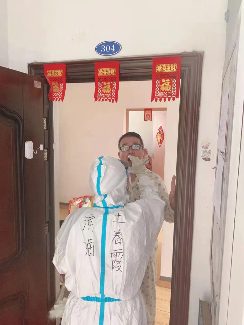 7月25日,我們轉(zhuǎn)戰(zhàn)到江寧區(qū)祿口街道這個此次疫情始發(fā)地。每天早上5:30,第一滴汗在頭發(fā)梢上滴下的時候,我們就出發(fā),穿著防護服、抱著檢測物資,走在去向居民家的路上。然后,在當?shù)厣鐓^(qū)志愿者帶領(lǐng)下,敲開一戶戶的門,看到一張張表情不安的臉孔,開始核檢,并帶走一支支樣本?!皬堊臁薄鞍 薄昂昧恕泵刻煲f幾百遍,最多的有上千遍。晚上結(jié)束后,有的同事感到頭暈。我們知道,那其實就是熱得輕度中暑的癥狀??!而我,當時也只覺得口舌艱難到像被膠水粘住一般。但是,大家明白,所有身體上的勞累,都不值得言說!真的,當作為一名支援抗疫的“戰(zhàn)士”奔赴戰(zhàn)場之時,這一切就全都在他們的意料之中。