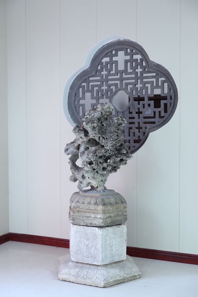 庭院石器展廳里,各石種玲瓏樸拙,古雅文質。靈壁石、太湖石、英德石、昆石“四大名石”,這里兼而有之,可謂方寸天地,氣象萬千。有塊刻石長48cm、寬40cm、厚6cm長方體的灰太湖石石刻,為明人以元代宗師趙孟頫《枯木竹石圖》為粉本勒石。據(jù)考臺北故宮博物院趙孟頫《枯木竹石圖》就是此庭院刻石原本。