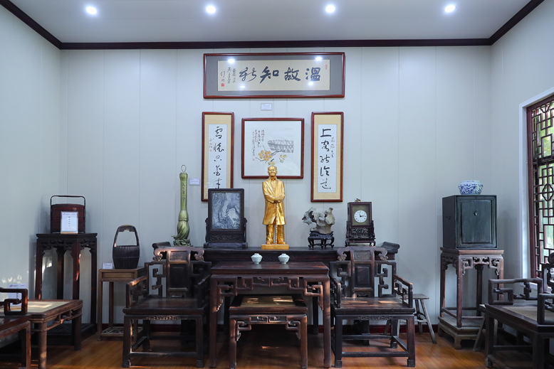明清古家具展廳里,陳設有致,明清的書房及廳堂家具,按不同木質分柞榛、紅木、櫸木三個區(qū)域。各個區(qū)域每張家具好似一位位靜坐著的白發(fā)蒼蒼老者,在無聲敘說著時代的變遷和歲月的滄桑。