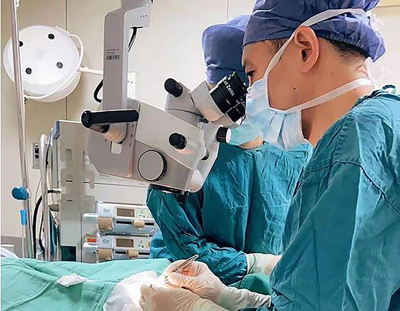 看到這樣一個病情復(fù)雜的病例以及老人無助期待的眼神,作為一名有著多年黨齡的眼科醫(yī)務(wù)人員,雖有些猶豫,但醫(yī)生的職責(zé)告訴自己:只要有1%的希望,就要做100%的努力。楊愛民帶領(lǐng)眼科團(tuán)隊詳細(xì)研究病情,分析了術(shù)中術(shù)后可能出現(xiàn)的各種情況,并邀請?zhí)悄虿】萍澳I內(nèi)科醫(yī)生對患者的全身狀況進(jìn)行綜合評估。經(jīng)過充分準(zhǔn)備,楊愛民為患者在局麻下實施了“右眼虹膜囊腫切除+瞳孔放射狀切開+白內(nèi)障超聲乳化+折疊式人工晶體植入術(shù)”。手術(shù)順利,術(shù)后第二天患者視力檢查結(jié)果為0.15,讓患者及其家人露出了久違的笑容。