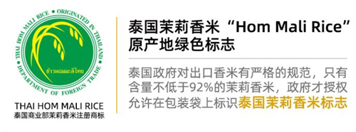 泰國商業(yè)部外貿廳注冊了泰國香米質量標準認證標志:Thai Hom Mali Rice(泰國茉莉香米)綠色圓形的原產地注冊標志。