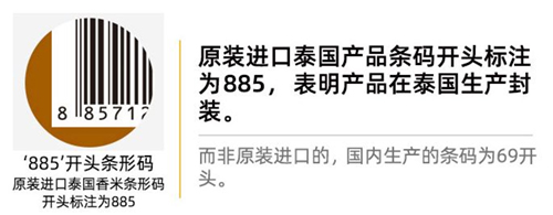 原產地包裝原裝進口泰國香米的包裝條形碼以88開頭,“69”條碼的泰國茉莉香米則是在國內分裝的。