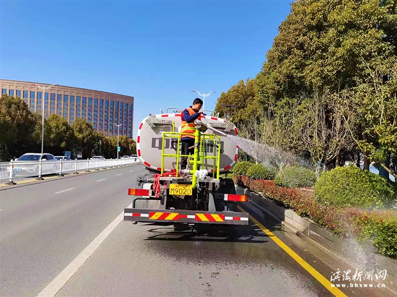 在做好道路增濕抑塵的基礎(chǔ)上,同步開展綠化帶“除塵增綠”行動,出動園林綠化灑水車2輛,每天對西湖路、港城大道、景湖路等主干道密集綠化帶進行灑水除塵作業(yè),日均“煥新”綠化帶面積4萬余平方米,用水量約64噸。