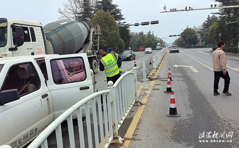 四是交通護(hù)欄應(yīng)急搶修??焖俳M織維修人員對各路段(尤其是學(xué)校、住宅小區(qū)、商業(yè)街區(qū)等人員密集區(qū)域)巡查發(fā)現(xiàn)的撞損、缺失交通護(hù)欄進(jìn)行應(yīng)急搶修,通過設(shè)置錐形警示標(biāo)志,提醒過往車輛謹(jǐn)慎駕駛和注意行人,高效完成交通護(hù)欄搶修工作,確保道路恢復(fù)暢通,累計應(yīng)急搶修港城路、鳳鳴路等路段破損交通護(hù)欄50余米。