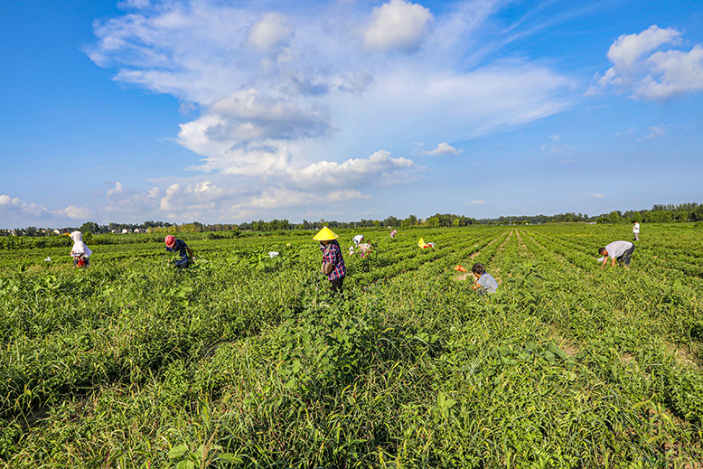 8月15日,記者在界牌鎮(zhèn)周莊村菊花種植基地看到,村民們?nèi)宄扇海χo基地的菊花除草,田間不時(shí)傳來陣陣歡笑聲。