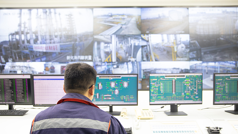 在江蘇新化化工有限公司的中控室內(nèi),工作人員正通過先進的智能化管理系統(tǒng)實時監(jiān)控生產(chǎn)過程中的各項數(shù)據(jù),并對生產(chǎn)現(xiàn)場集中管控、指揮調(diào)度,最終實現(xiàn)生產(chǎn)過程透明化、可視化、精細化。