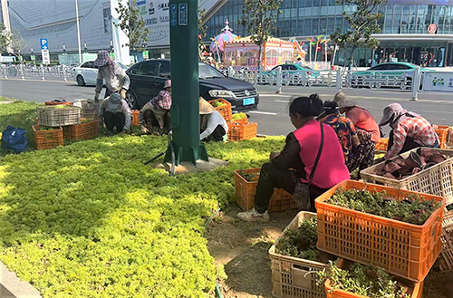 在港城大道、朝陽(yáng)路、富康路、S327、中市路、幸福路、人民路、育才路、向陽(yáng)大道等12條主次干道(尤其是道路交叉渠化區(qū))上,50余名園林綠化工人正搶抓時(shí)間栽植新鮮的草花。為保障栽種效果和質(zhì)量,前期對(duì)原有地塊重新翻新、清理、施肥,嚴(yán)格篩選草花,做到規(guī)格、株型、品相相對(duì)統(tǒng)一;在栽植過(guò)程中,講究“株距合理、整齊劃一、色彩搭配、布局美觀”的原則;栽植后及時(shí)灑水養(yǎng)護(hù),做到“即栽即灑”“即灑即補(bǔ)”,減少栽后草花萎靡、枯死等情況發(fā)生。