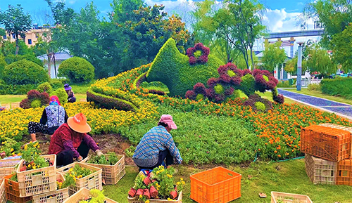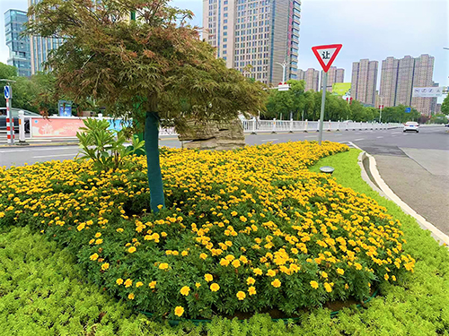 整體上選用五色草(紅草、綠草)、歐石竹、佛甲草、中華景天、姬巖垂草等累計(jì)64735盆535平方米的草花上架,搭配210盆15120平方米孔雀草(橙黃)作為地?cái)[地栽,整體高低錯(cuò)落有致,像一幅幅巨大的立體畫(huà)卷拔地而起,具有較高的觀賞價(jià)值。在高速口出口處,巨型口號(hào)標(biāo)語(yǔ)振奮人心,下面是14個(gè)大小不一的綠化造景球,幾只栩栩如生的靈鹿萌趣十足;在體育廣場(chǎng)西側(cè),“中國(guó)夢(mèng)”字標(biāo)、和平鴿、東方日出、蝴蝶等元素展現(xiàn)新時(shí)代濱城人民對(duì)美好生活的向往和追求;在西湖公園東門(mén)處,巨大的花籃里鮮花盛放,周邊搭配綠植小景,寓意祖國(guó)繁榮昌盛、人民生活和美向上……