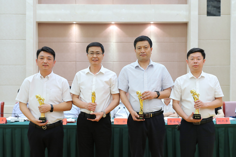 獲得“金牛獎”的縣交通控股集團(tuán)、縣行政審批局、蔡橋鎮(zhèn)、坎北街道負(fù)責(zé)人上臺領(lǐng)獎。