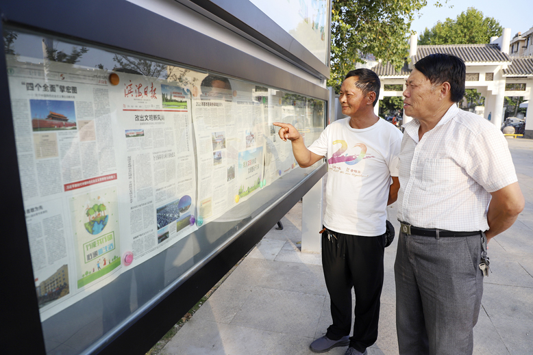 市民在黨報(bào)閱報(bào)欄前閱覽《濱海日?qǐng)?bào)》。 (本報(bào)記者 邢馨 攝)