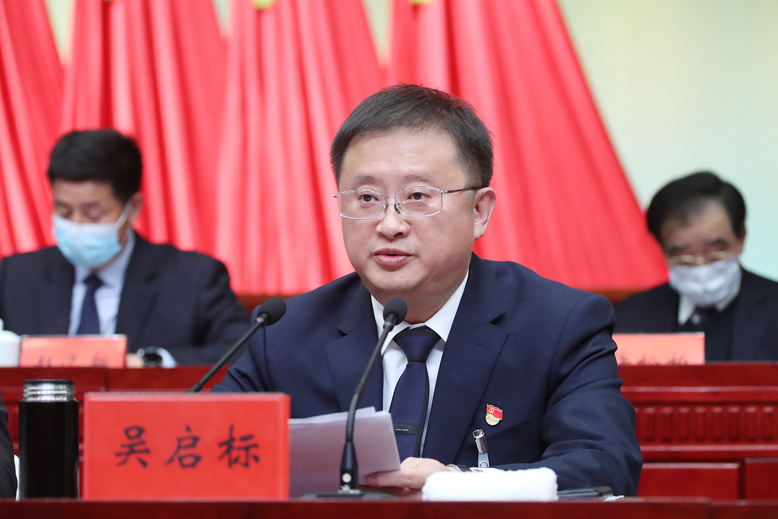 1月24日,縣委書記、縣長吳啟標(biāo)在政協(xié)濱??h十四屆一次會議上講話。(本報記者 陳其龍 攝)